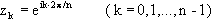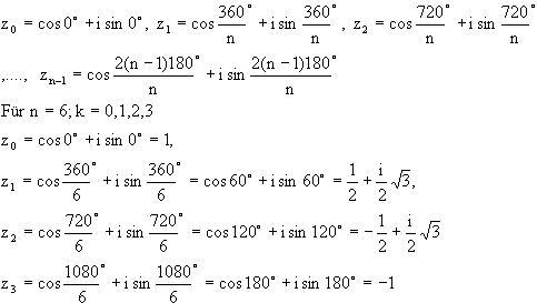 | Die n-te Einheitswurzel z = Es ist in diesem Fall w = 1, also r = 1, j = 0° und k = 0,1,2,..,(n-1). (2kp = k360) Man erhält also: |